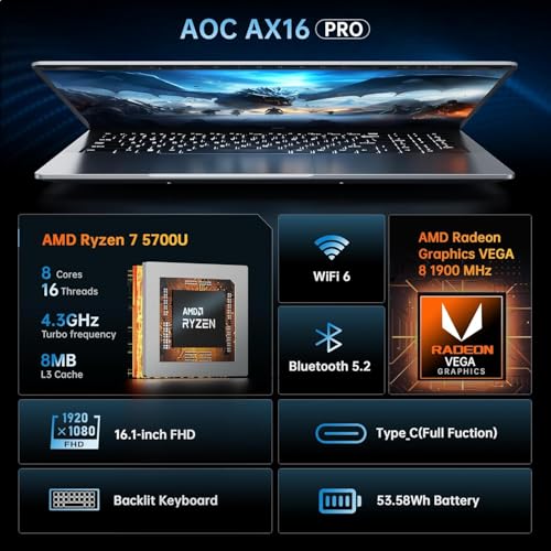 - 【 Le noyau du monstre du jeu : Processeur AMD Ryzen 7 5700U 】 Bienvenue dans le royaume des merveilles du jeu! L’ordinateur portable AOC est équipé du processeur AMD Ryzen 7 5700U, qui joue le rôle du noyau puissant d’un monstre du jeu! Avec sa conception à octa-cœurs, son cache de 8 Mo et ses fréquences pouvant atteindre jusqu’à 4,3 GHz, vous pouvez apprécier une vitesse et des performances inégalées lors de vos parties de Fortnite, LOL, Dota, Witcher, Dark Souls…
