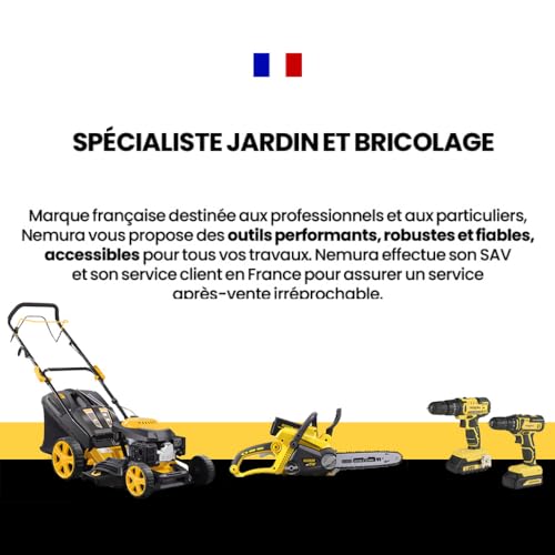 🇫🇷【 2 ANS DE GARANTIE ET SAV EN FRANCE 】Nemura est une marque française spécialisée dans les outils de jardinage et de bricolage. Destinés aux professionnels et aux amateurs, les outils Nemura sont innovants et simples à prendre en main. Ils offrent une qualité et une robustesse impeccables ainsi que de hautes performances. Une large gamme d’outillage thermique ou électroportatif, des taille-haies, des tondeuses, des perceuses, des scies…Choisissez l’excellence à la française.