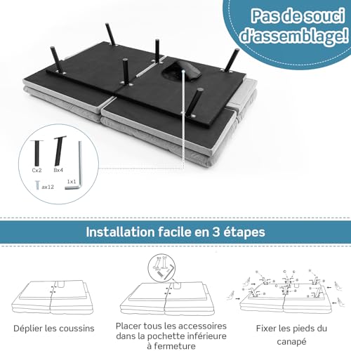 ★ASSEMBLAGE EN 3 ÉTAPES★Le canapé-lit futon ne nécessite pas d’assemblage expert et peut être installé en seulement 3 étapes : dépliez les coussins, trouvez tous les accessoires dans la poche inférieure zippée, puis fixez les pieds du canapé. Si nécessaire, vous pouvez essuyer la poussière et le garder propre avec un chiffon doux.