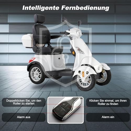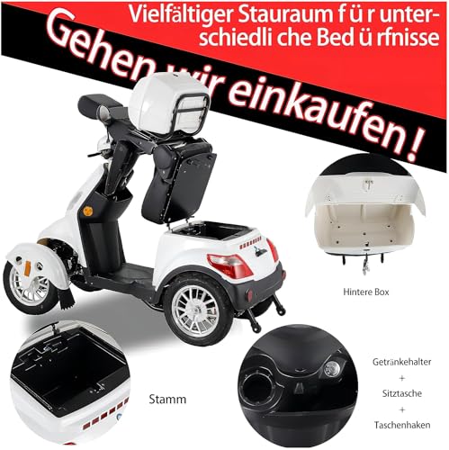 Scooter électrique à 4 roues avec 3 vitesses, grand espace de stockage, tête et accoudoirs réglables et dossier. Convient pour différents terrains avec phares, feux arrière et…